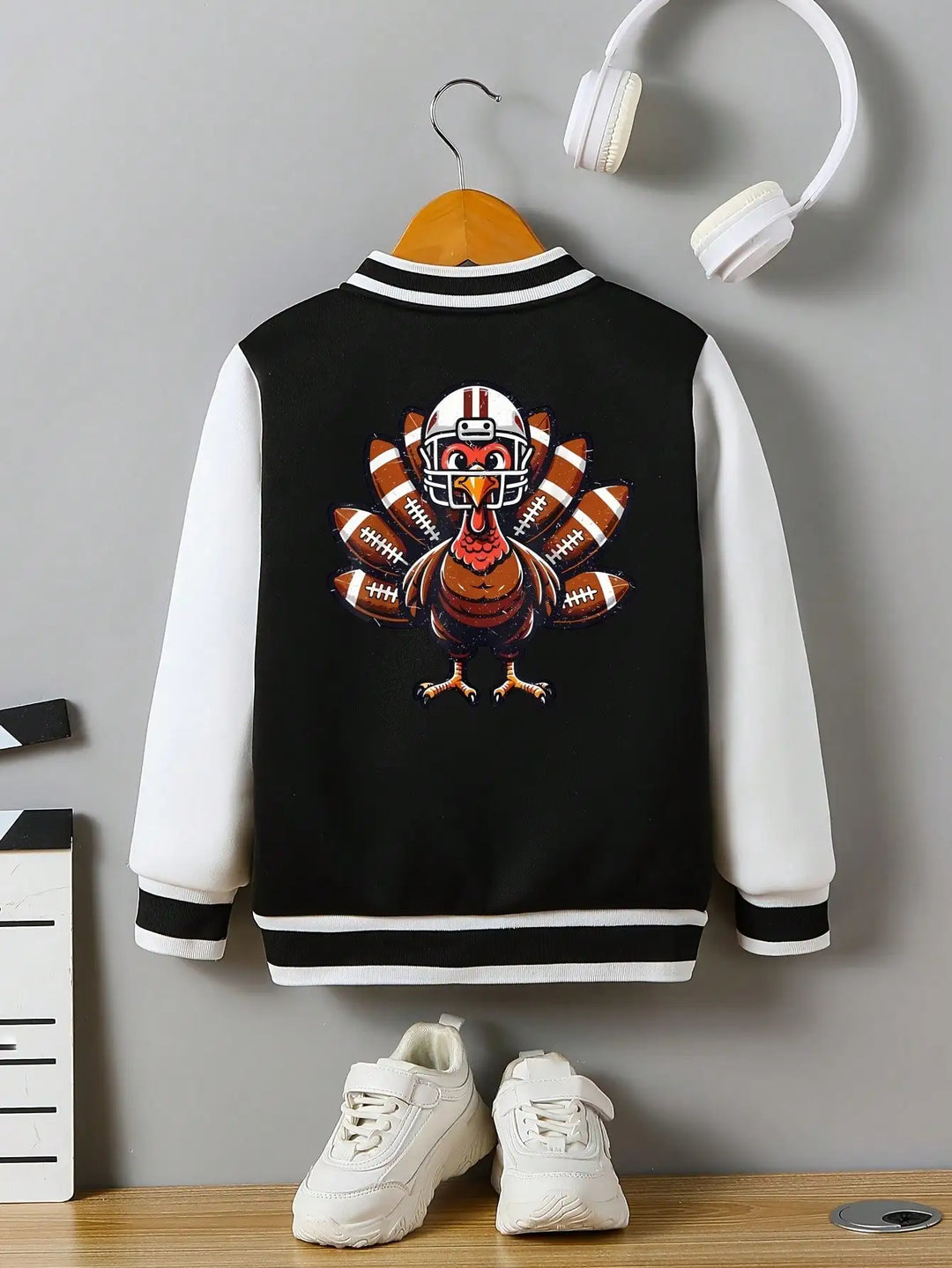 Children's baseball jersey, Thanksgiving football chick with pocket, holiday party, back print. The child's gift