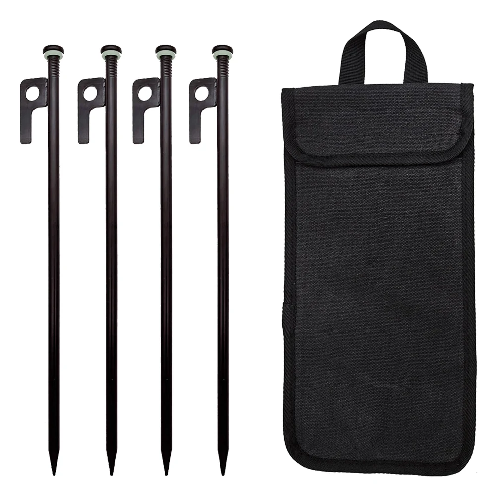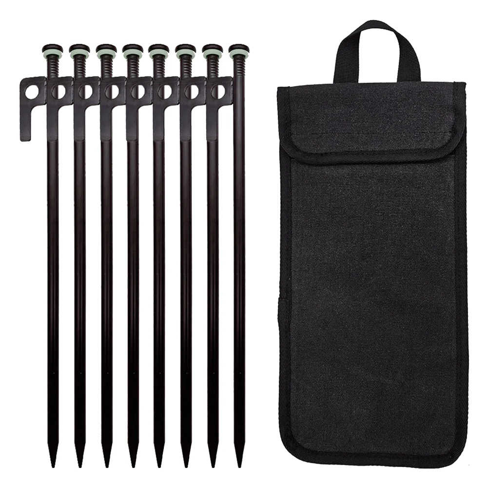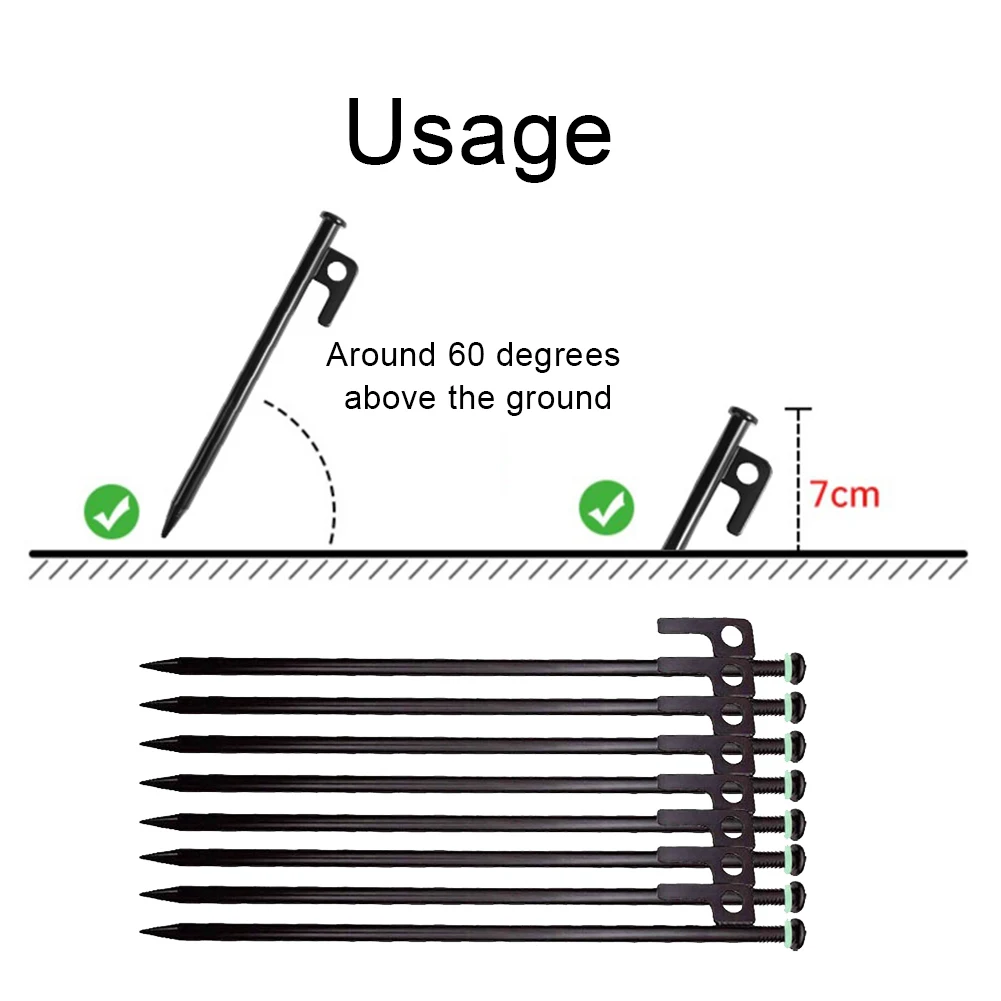 1. Sturdy Tent Stakes: Ensure your tent's stability with our tent stakes, crafted from high-grade forged steel for rust resistance and durability. Measuring 11.8 inches, each stake is designed to penetrate and anchor firmly in a variety of soils, complemented by a fluorescent rubber loop for visibility.