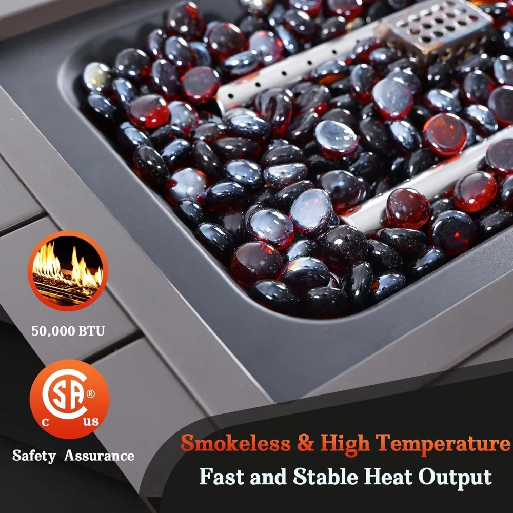 - Pulse Ignition system: the fire pit table is supplied with ignition protection for your family's peace of mind. The flame size is adjusted by a knob. The glass beads gather heat more quickly and make the flame more beautiful