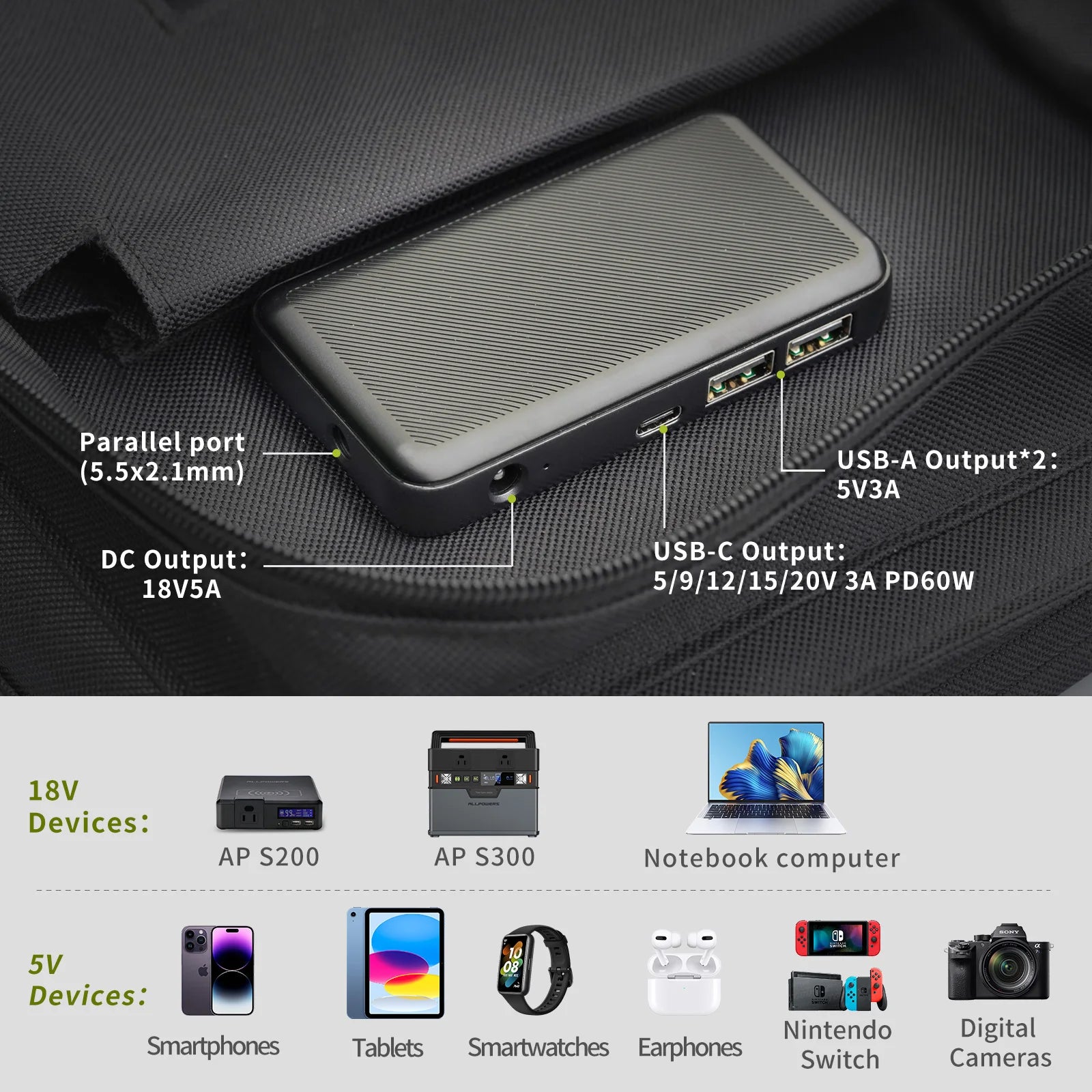 【18VDC+USB-C PD60W+USB-A*2 output, can power 4 devices at the same time.】