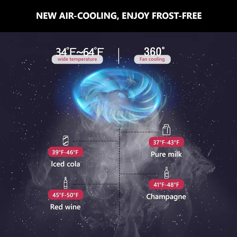 - 【Refrigeration & Cooling Storage 2-in-1】This beverage fridge using new air cooling technology, 360° full-angle circulating air duct cooling will be more even, the small refrigerator uses tempered glass door with low-e film and high tightness door seal, to achieve refrigeration and at the same time to ensure that the cold air does not spill out