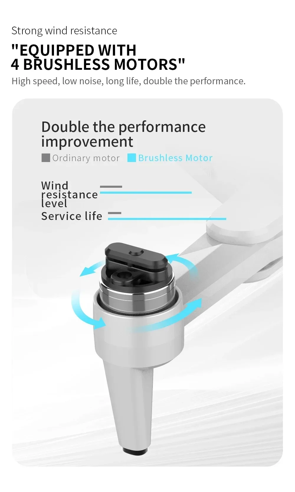 - Brushless Motor. It is so quiet but very powerful when running. Breakdown rarely occurs and motor replacement is seldom required, which makes your flight more enjoyable.
