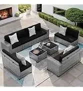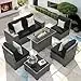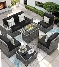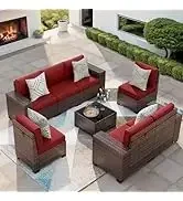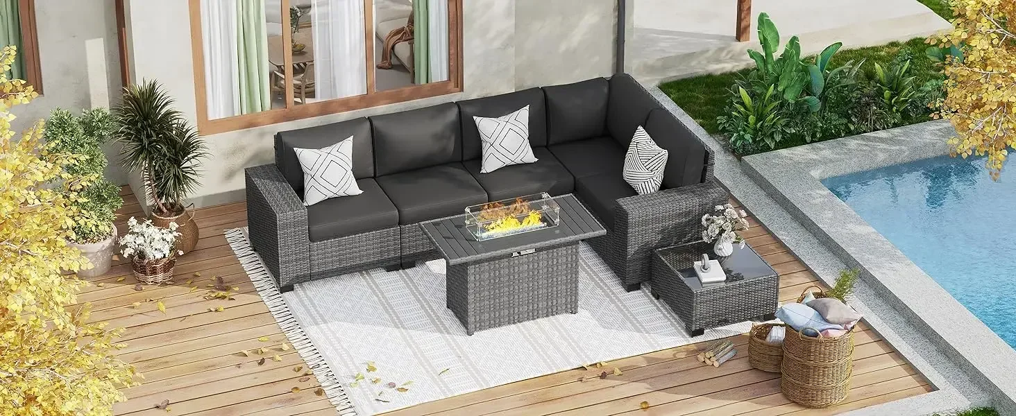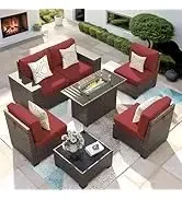 RPD4-7 Piece Patio Furniture Set Fire Pit Table. Outdoor Conversation Sets Wicker Rattan Sectional Sofa with Coffee TSZ