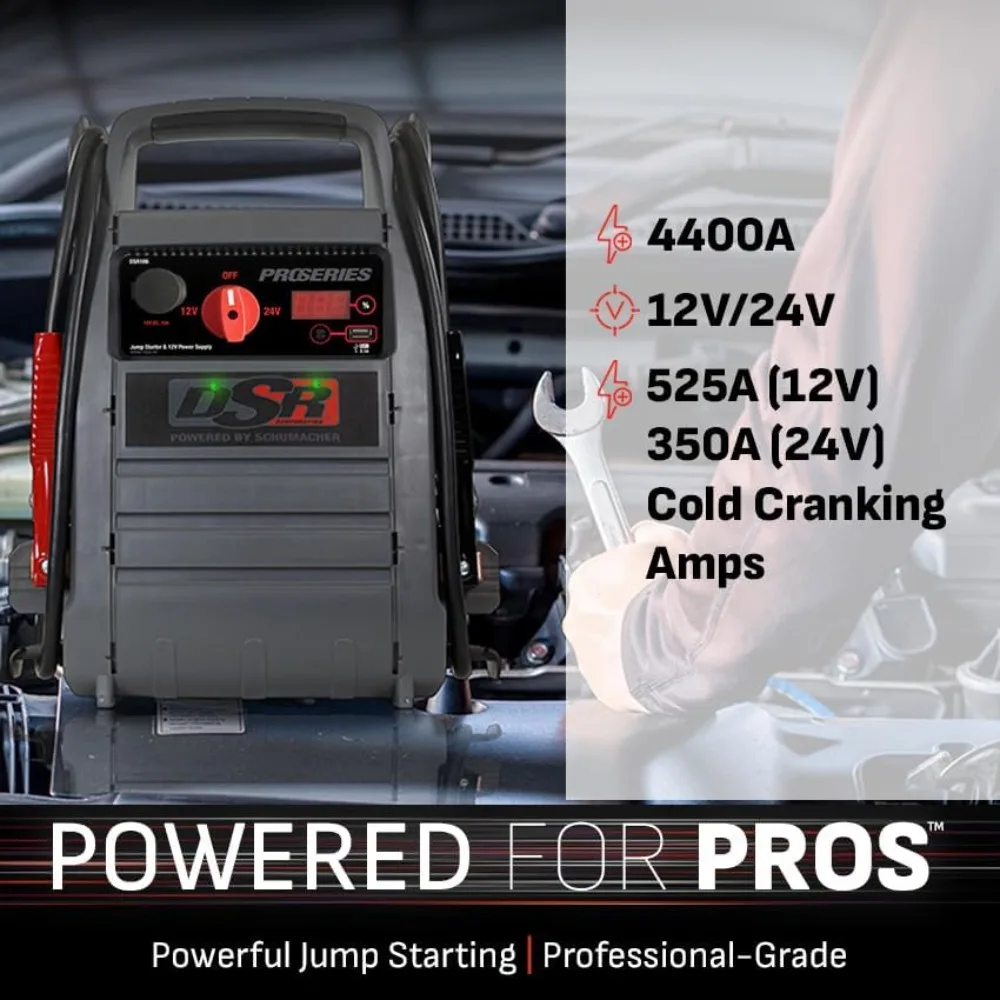 Professional Grade-Performance - This portable car battery jump starter can deliver 4400 peak amps, 750A (12V) / 475A (24V) cranking amps, and 525A (12V) / 350A (24V) cold cranking amps to jump-start cars, trucks, SUVs, and 24V semi-trucks.